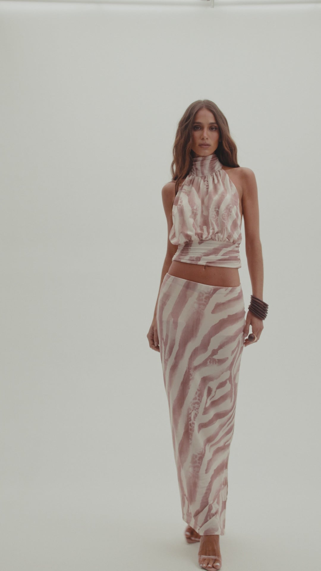 Design: A two-piece, high-impact set. Halter-style blouse with a draped high neckline, paired with a long skirt featuring a straight, fluid silhouette. The skirt has a contemporary low-rise waist and a back slit at the hem for enhanced mobility.
