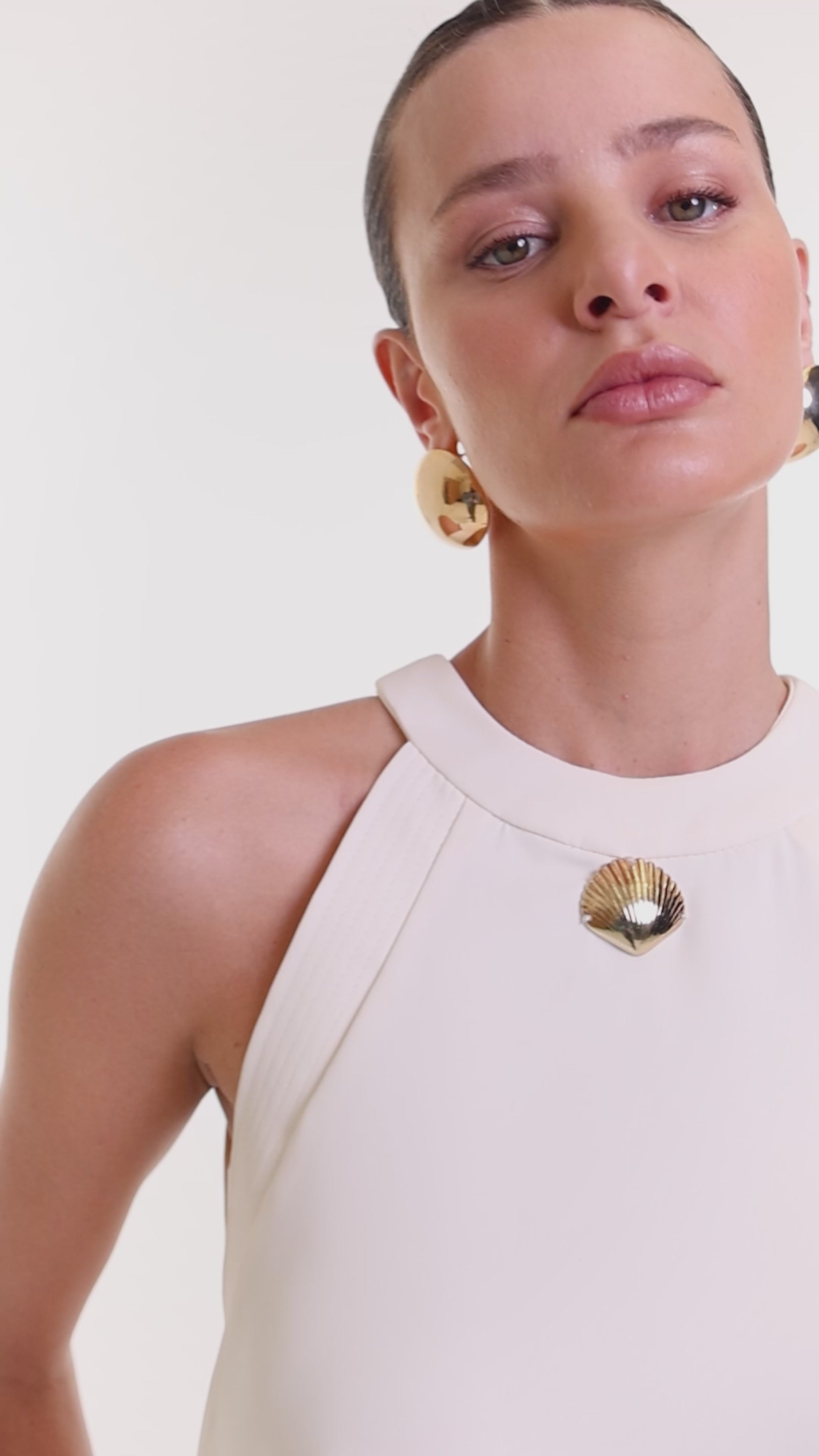 Versatile and sophisticated, this blouse is crafted from lightweight crepe that offers both comfort and elegance. The design features a high neckline adorned with a metallic seashell-shaped pendant, adding a charming detail that eliminates the need for accessories at the neckline. With its slightly flared cut, the piece provides fluidity and movement, flattering different body types. Delicate topstitching near the shoulders enriches the look with subtle refinement, while the back button closure with a small teardrop opening adds a feminine touch.