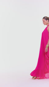 This long dress embodies elegance in its lightest and most fluid form. Crafted from crepe georgette, a natural fiber crepe with a luxurious touch and exceptional drape, it offers graceful movement and a refined look, perfect for special occasions. The loose silhouette ensures comfort and ease, while the halter neckline with back tie elegantly enhances the décolleté. Delicate front draping near the neckline adds a feminine touch, balancing the structure of the design with softness.